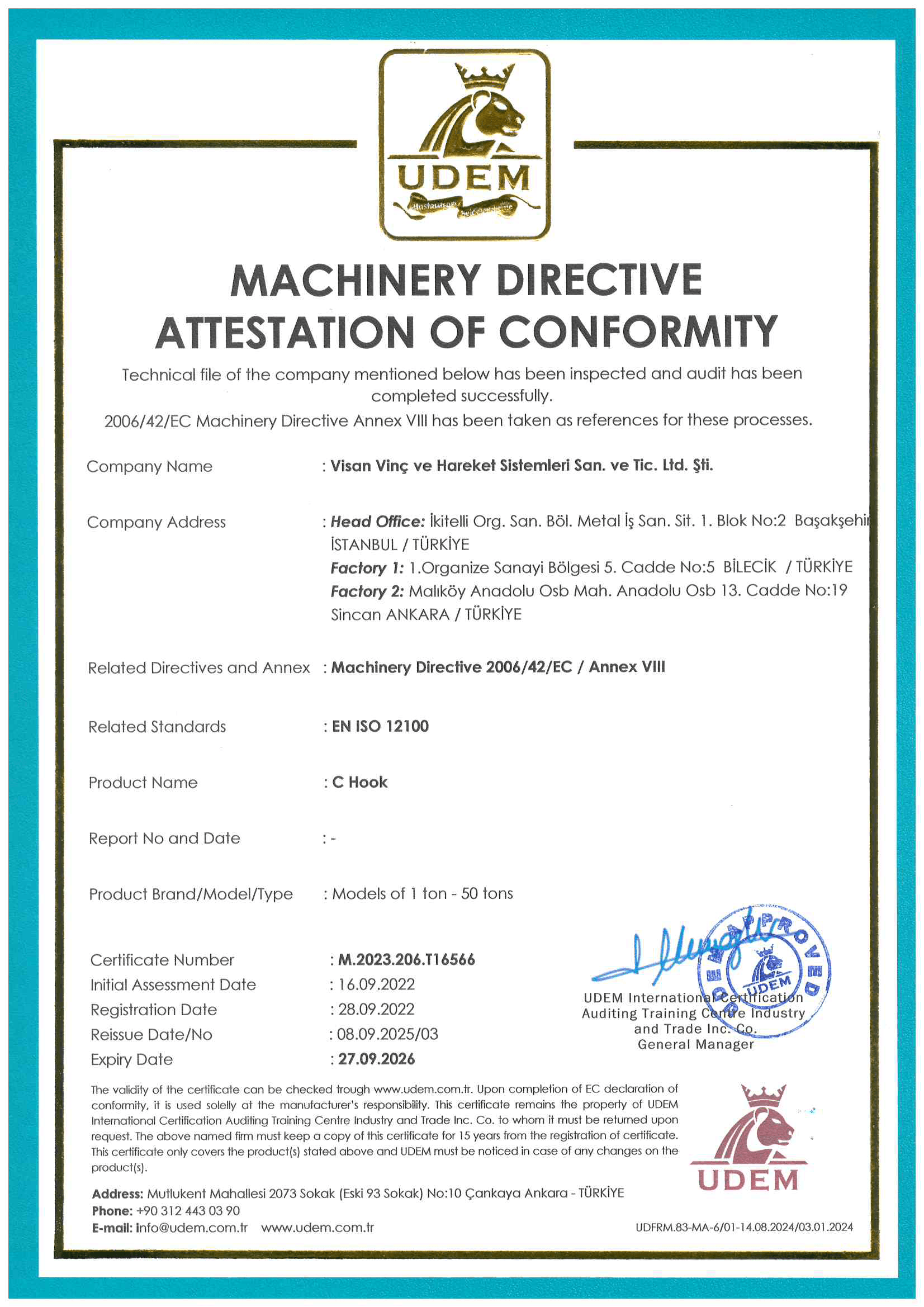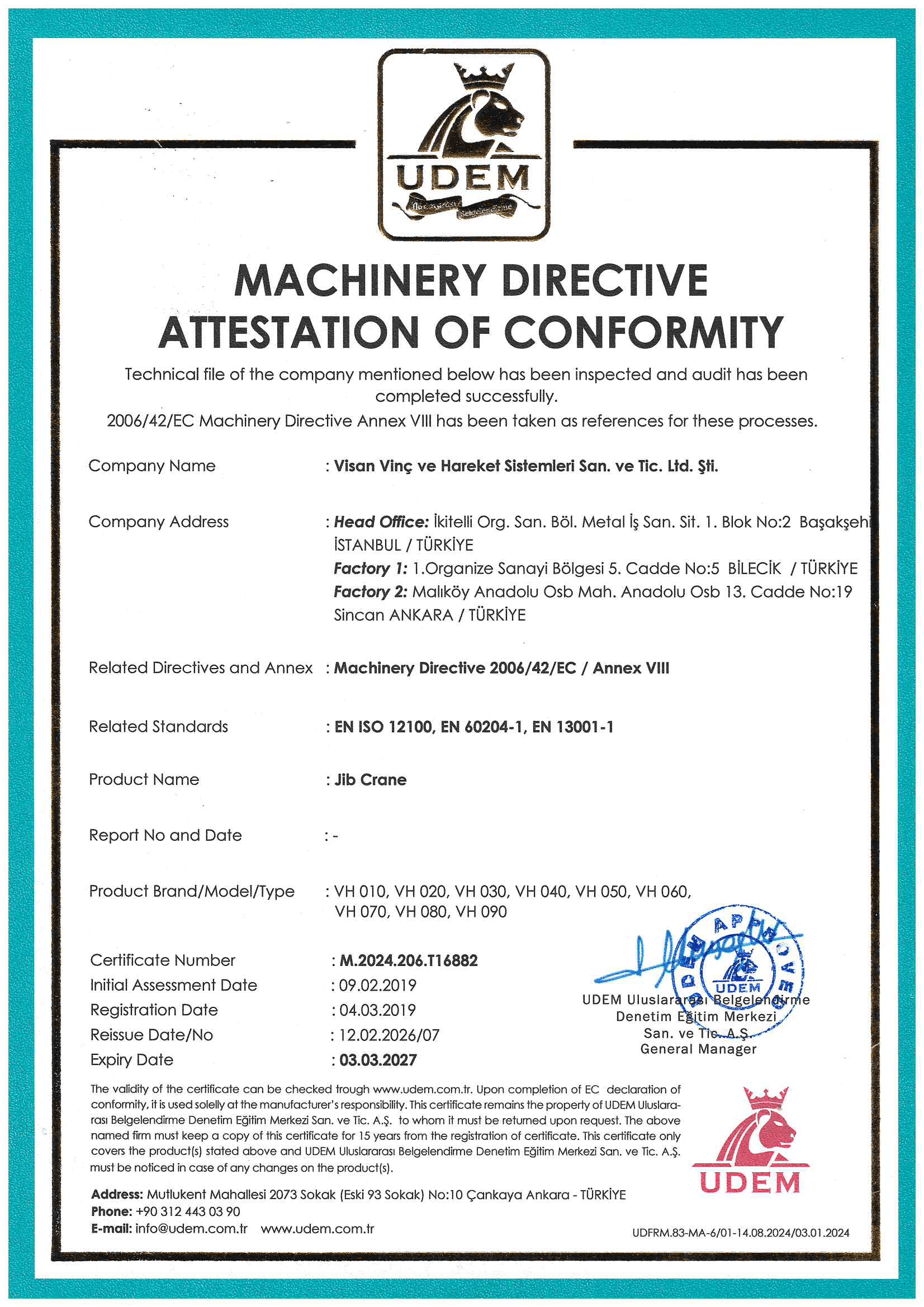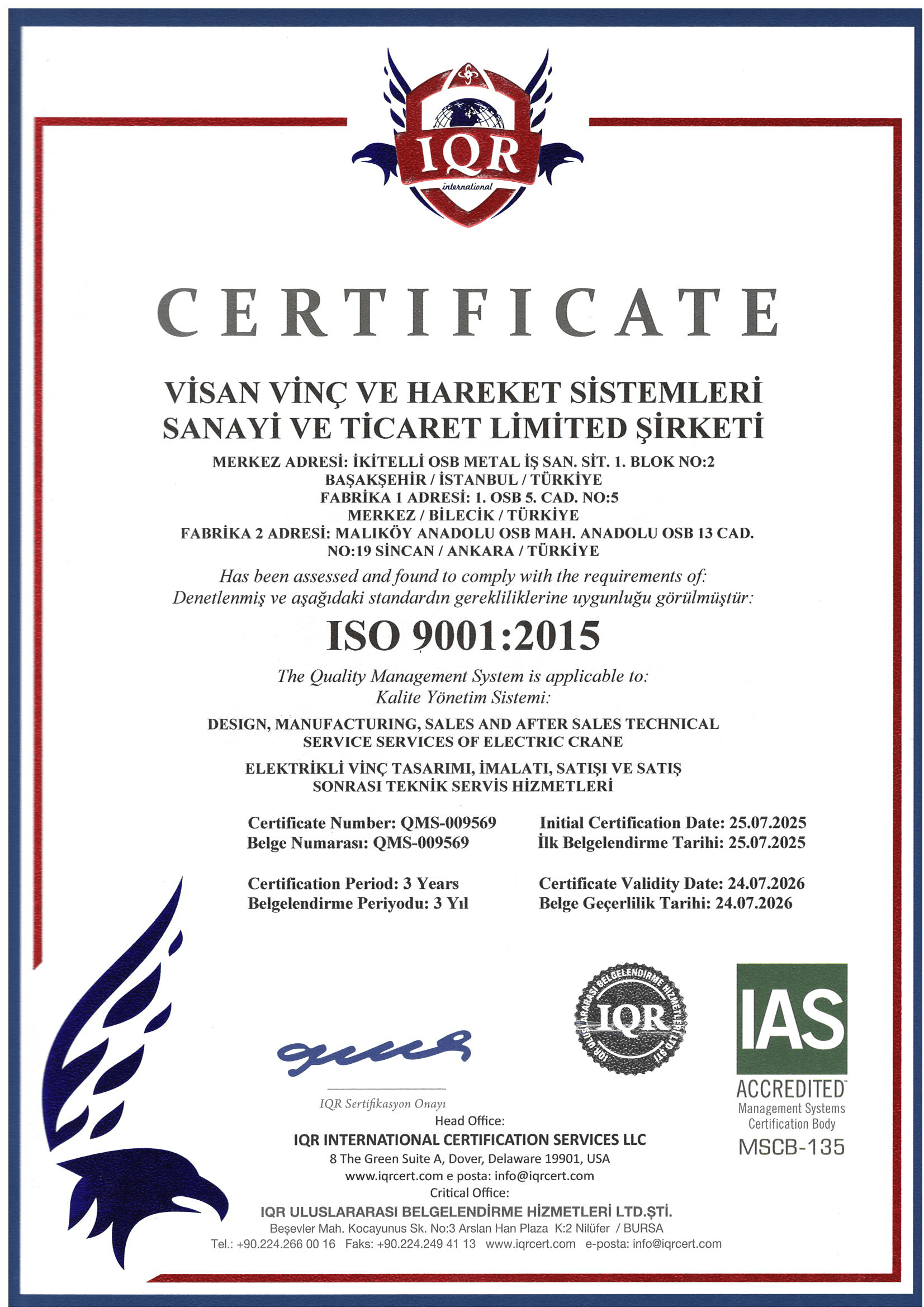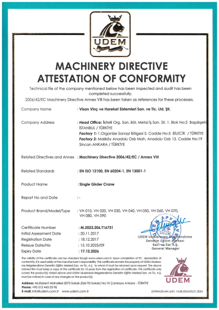 Founded and operational since 2000, Visan Crane is one of Turkey’s largest companies in the production and servicing of electric cranes, single girder overhead cranes, double girder overhead cranes, portal cranes, jib cranes, and crane accessories. With an annual production capacity of 1,000 units, Visan offers high-quality crane solutions and holds a reliable and leading position in the industry.